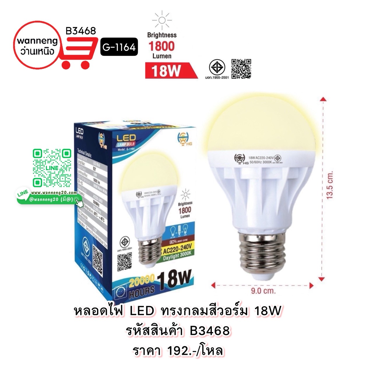 B3468 หลอดไฟ LED ทรงกลมสีวอร์ม 18W G-1164 1 โหล