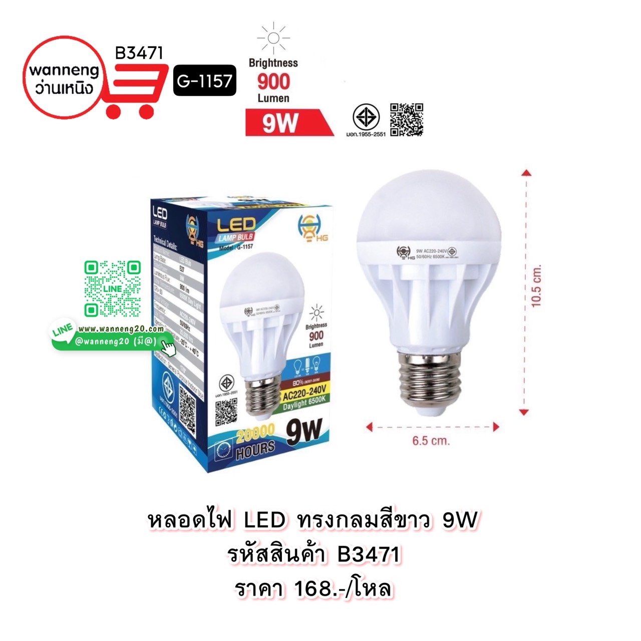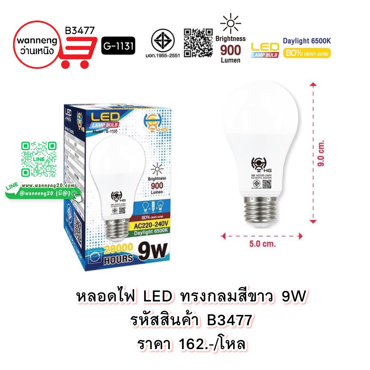 B3477 หลอดไฟ LED ทรงกลมสีขาว 9W G-1131 1 โหล
