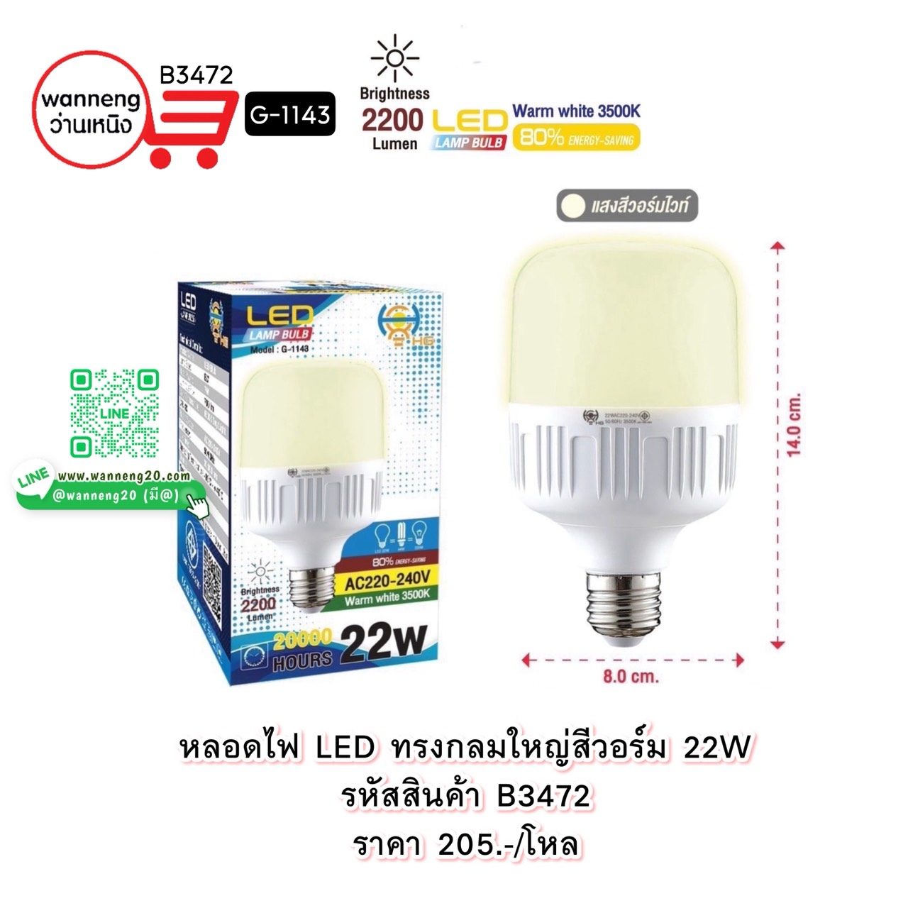 B3472 หลอดไฟ LED ทรงกลมใหญ่สีวอร์ม 22W G-1143 1 โหล