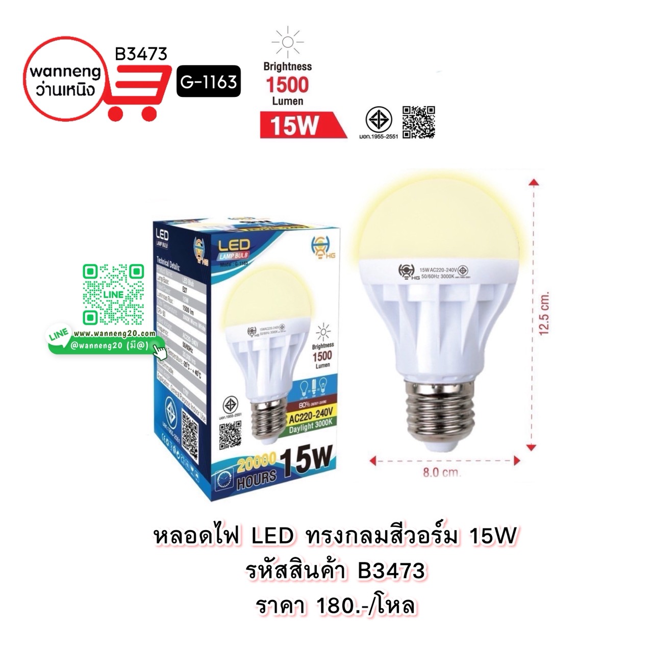 B3473 หลอดไฟ LED ทรงกลมสีวอร์ม 15W G-1163 1 โหล