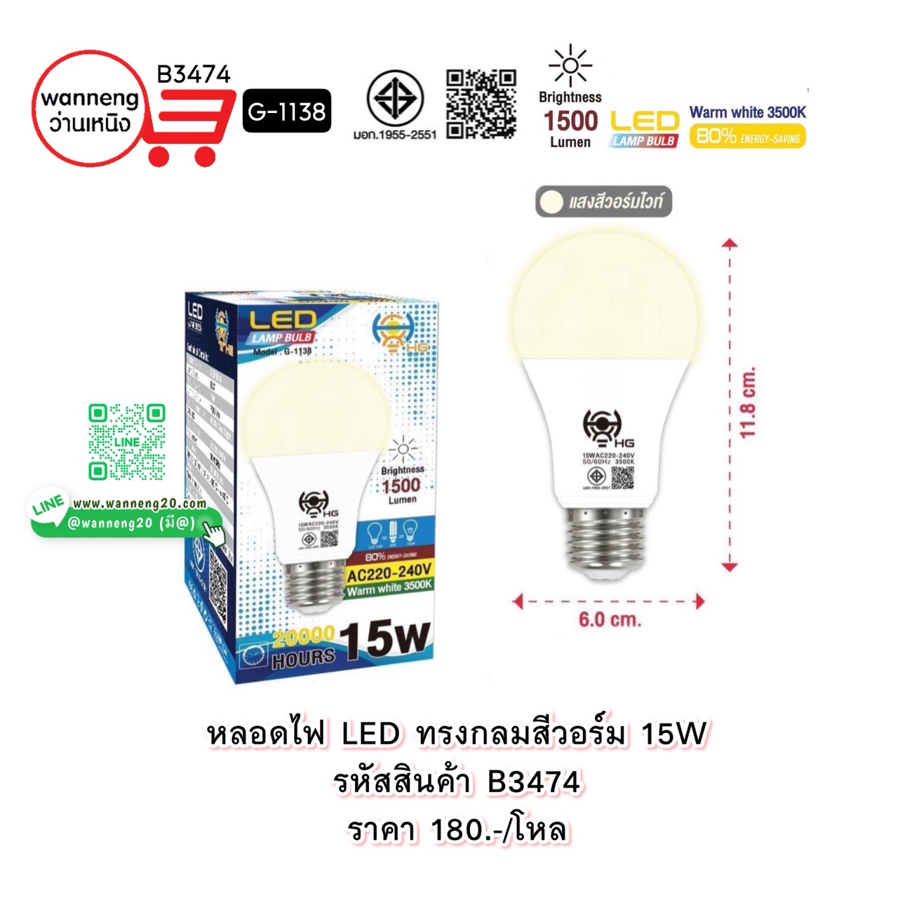 B3474 หลอดไฟ LED ทรงกลมสีวอร์ม 15W G-1138 1 โหล