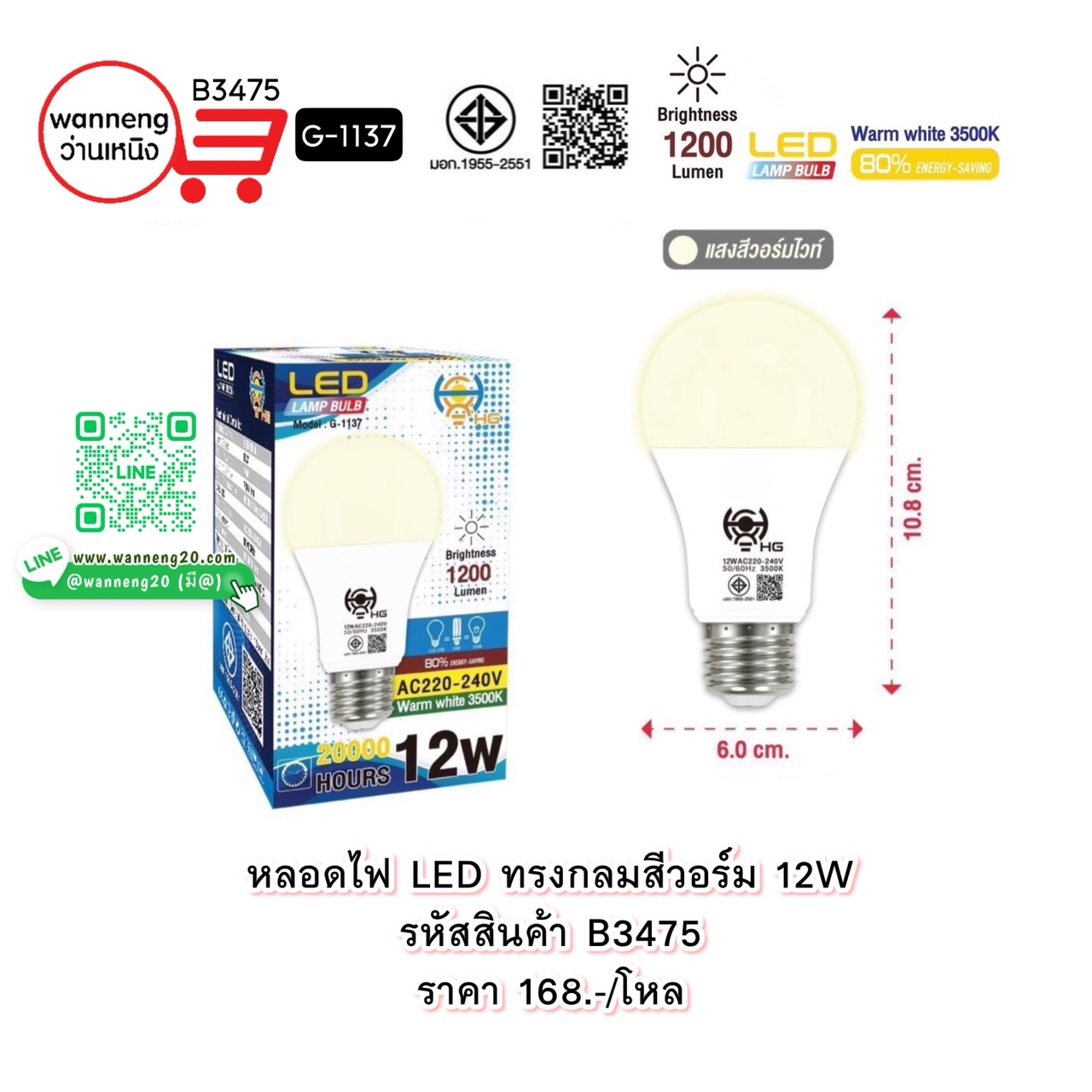 B3475 หลอดไฟ LED ทรงกลมสีวอร์ม 12W G-1137 1 โหล