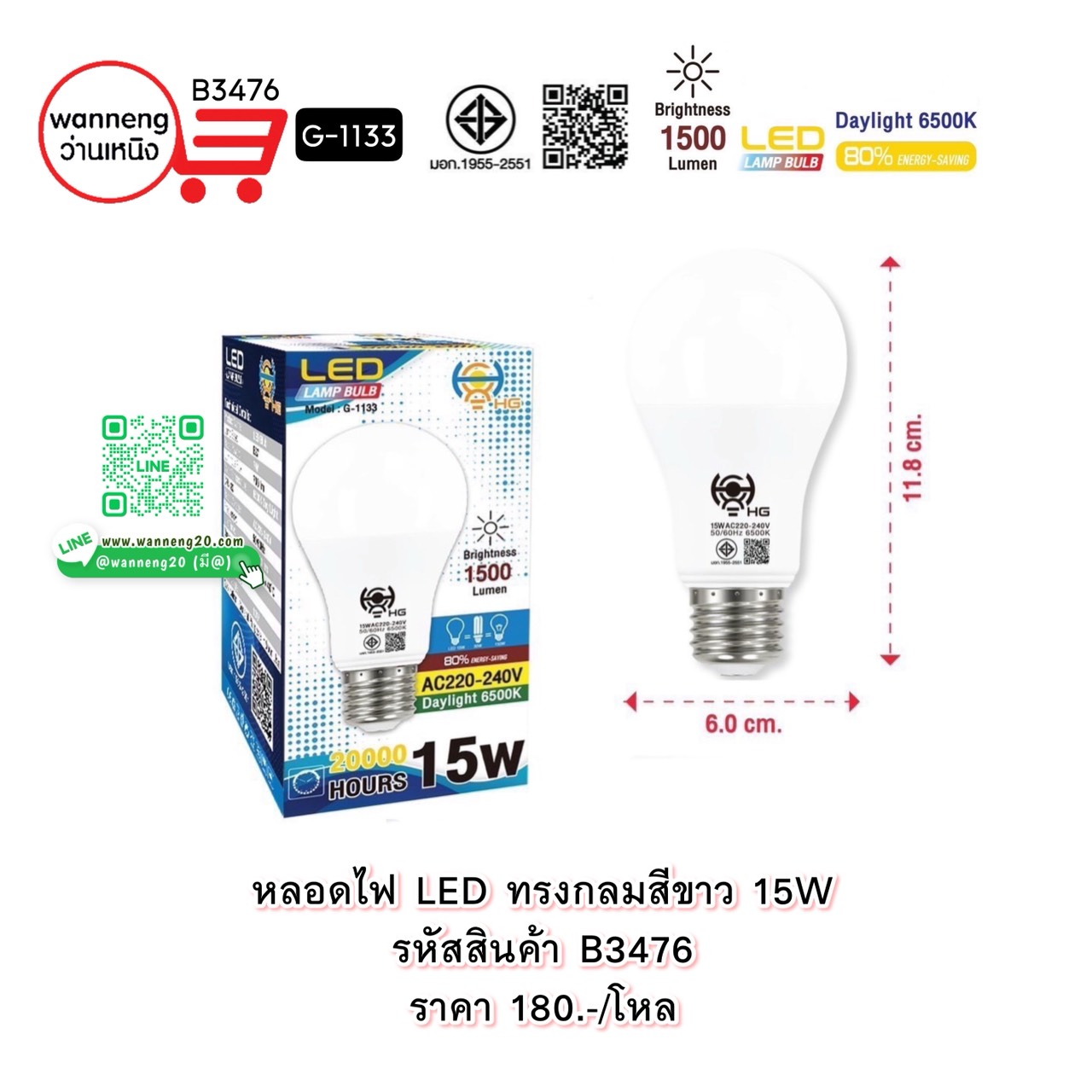 B3476 หลอดไฟ LED ทรงกลมสีขาว 15W G-1133 1 โหล