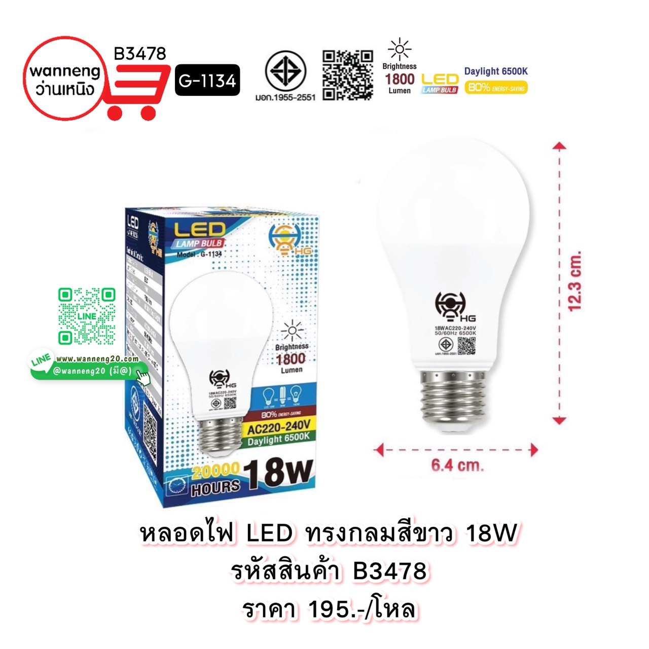 B3478 หลอดไฟ LED ทรงกลมสีขาว 18W G-1134 1 โหล
