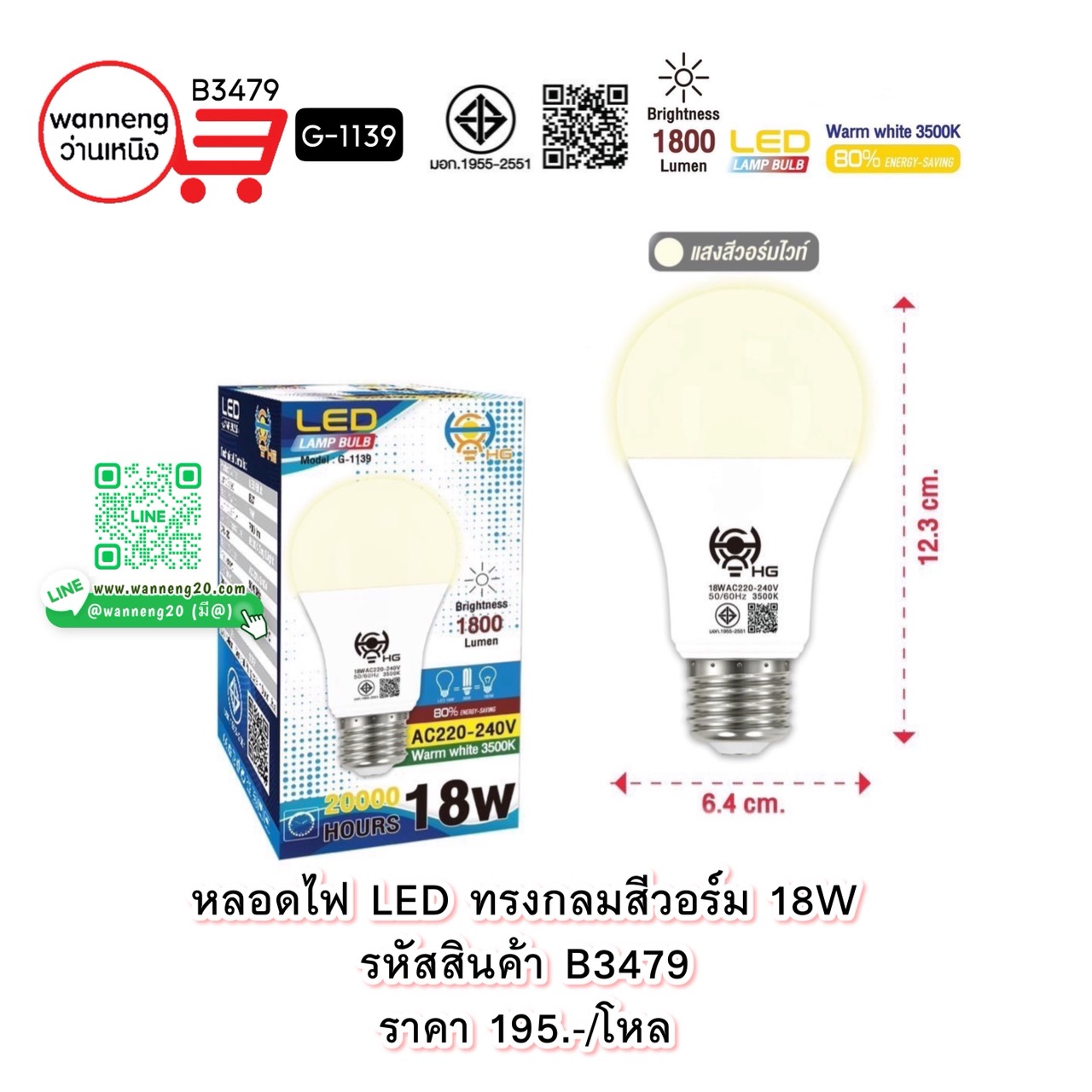 B3479 หลอดไฟ LED ทรงกลมสีวอร์ม 18W G-1139 1 โหล