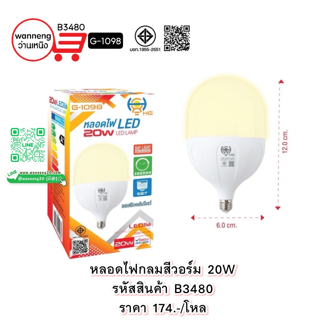 B3480 หลอดไฟกลมสีวอร์ม 20W G-1098 1 โหล