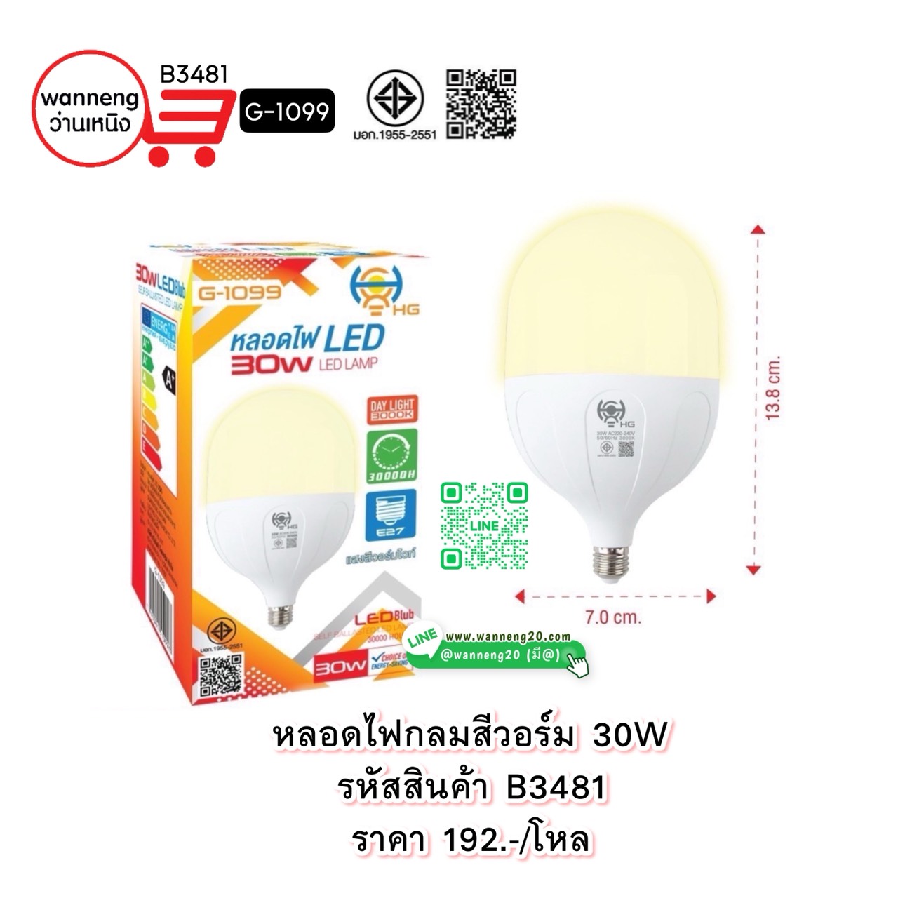 B3481 หลอดไฟกลมสีวอร์ม 30W G-1099 1 โหล