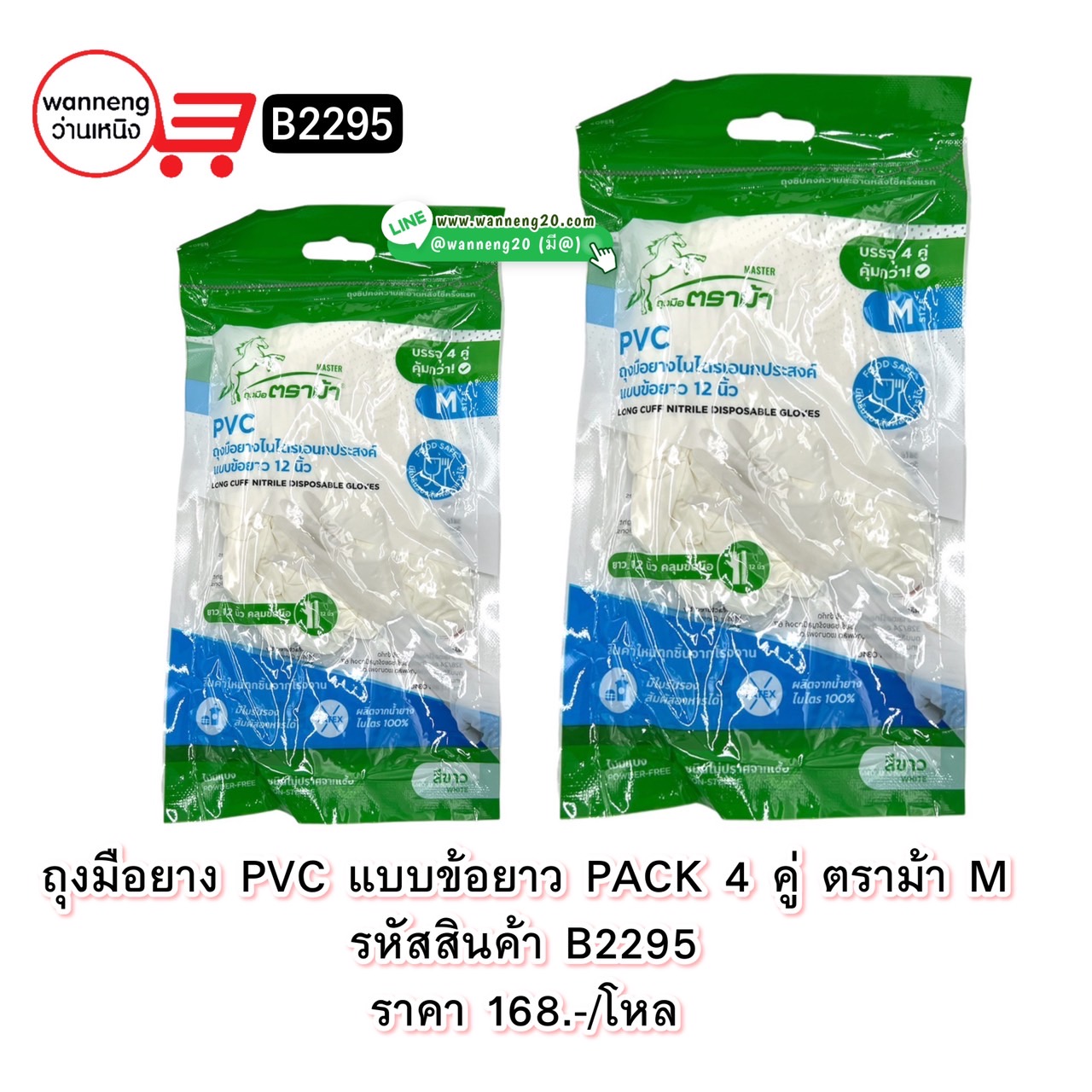 B2295 ถุงมือยาง PVC แบบข้อยาว PACK 4 คู่ ตราม้า M 1 โหล