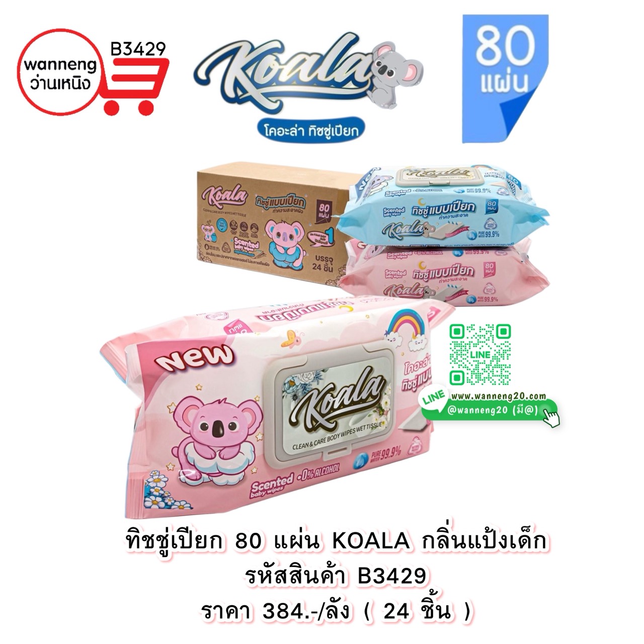 B3429 ทิชชู่เปียก80แผ่น KOALA (กลิ่นแป้งเด็ก) 1 ลัง 24 ชิ้น