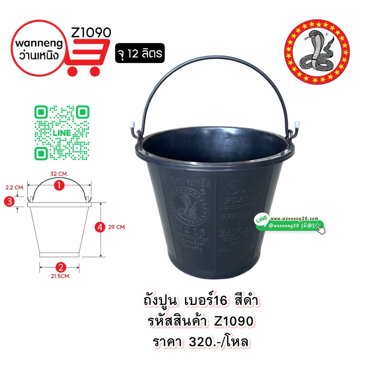 Z1090 ถังปูน เบอร์16 สีดำ (ตรางู) 1 โหล