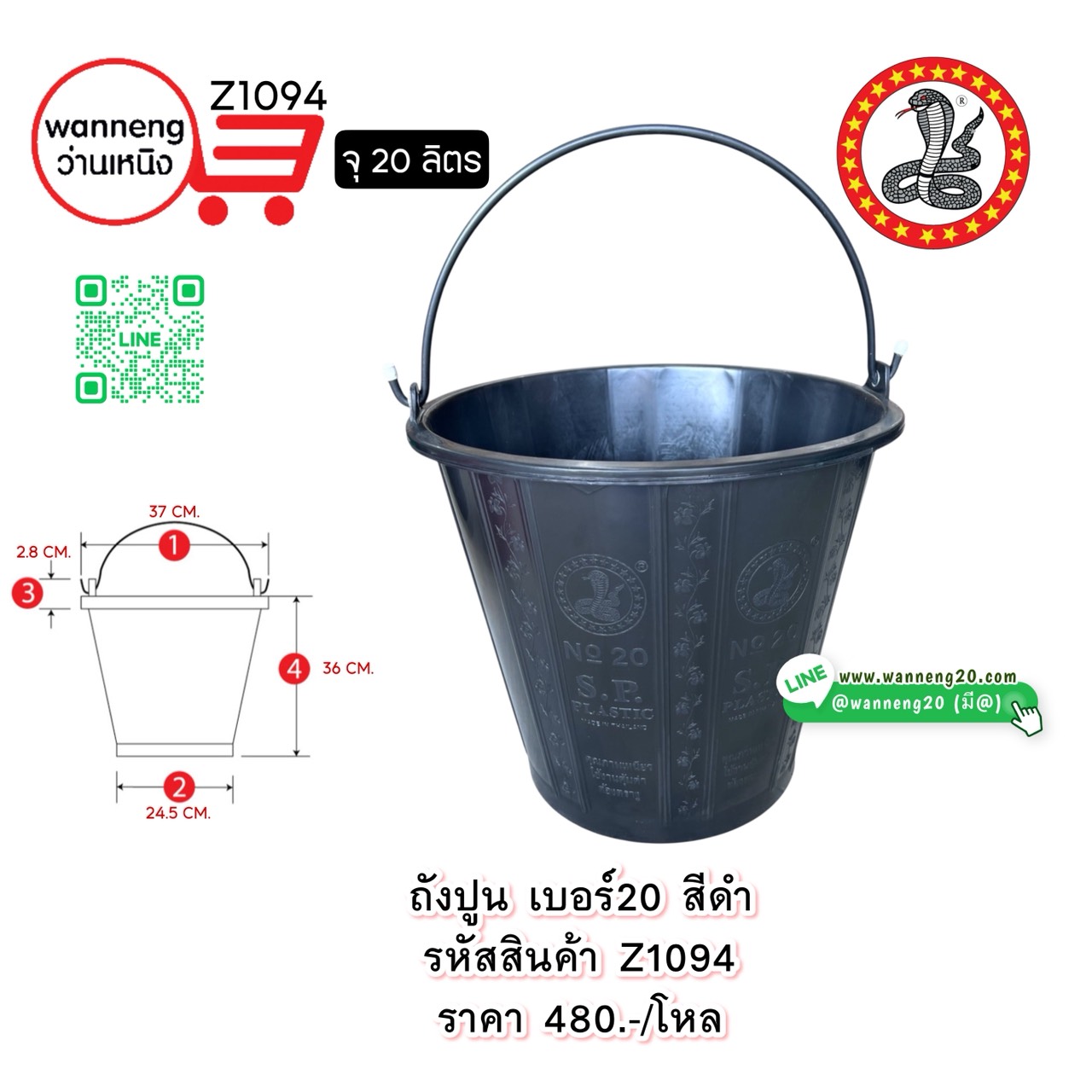 Z1094 ถังปูน เบอร์20 สีดำ (ตรางู) 1 โหล