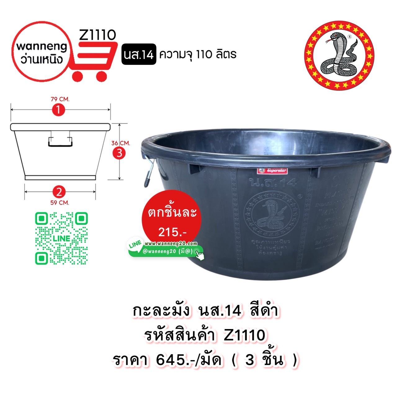 Z1110 กะละมัง นส.14 สีดำ (ตรางู) 1 มัด 3 ชิ้น