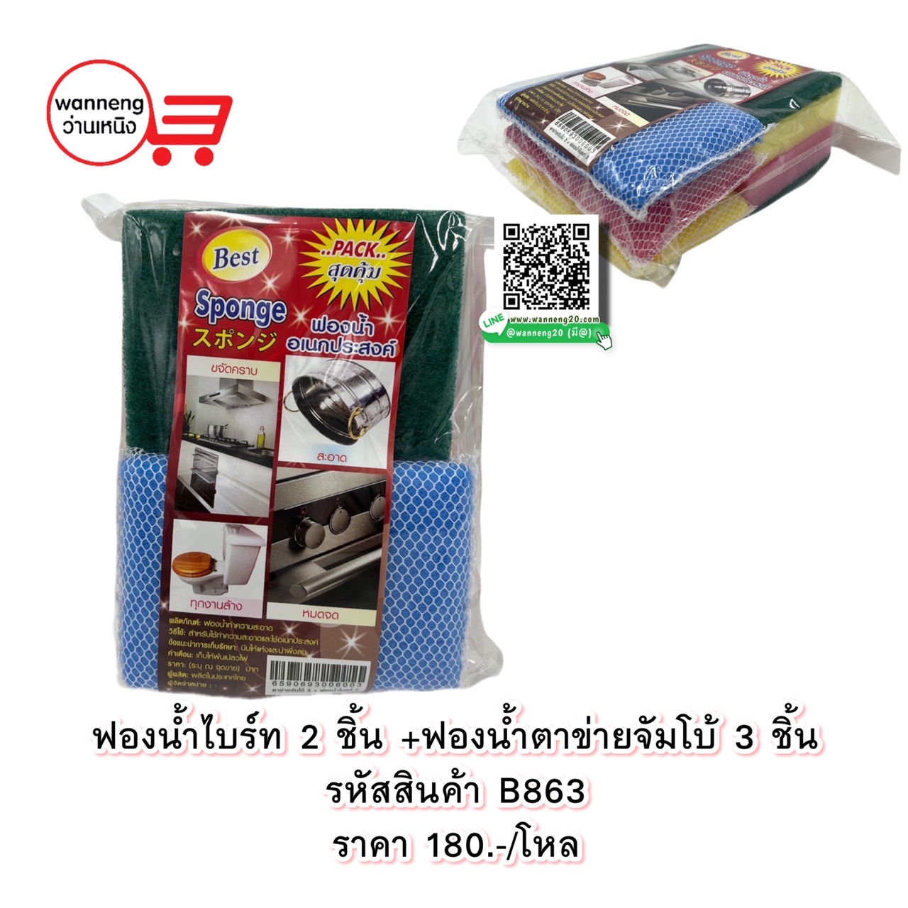B863 ฟองน้ำไบร์ท 2 ชิ้น + ฟองน้ำตาข่ายจัมโบ้ 3 ชิ้น 1 โหล