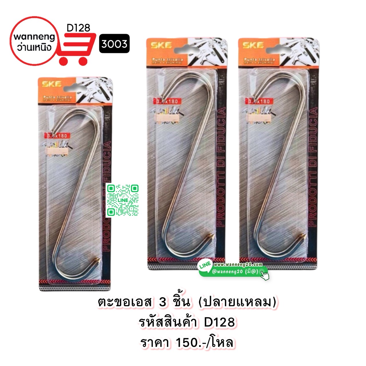 D128 ตะขอเอส 3 ชิ้น (ปลายแหลม) 3003 1 โหล