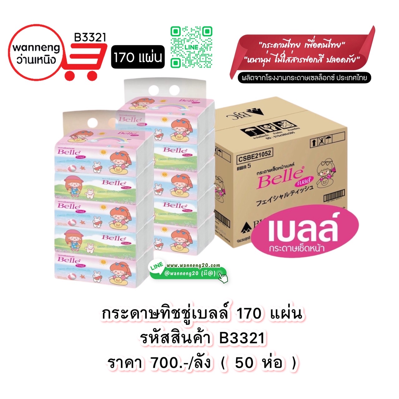 B3321 กระดาษทิชชู่เบลล์ 170 แผ่นคู่ 1 ลัง 50 ห่อ