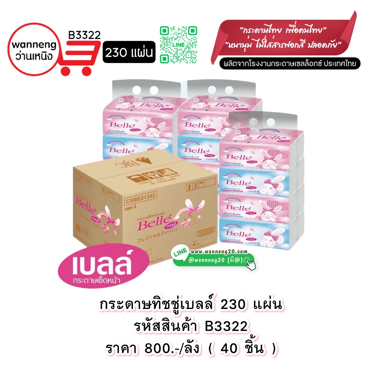 B3322 กระดาษทิชชู่เบลล์ 230 แผ่นคู่ 1 ลัง 40 ห่อ