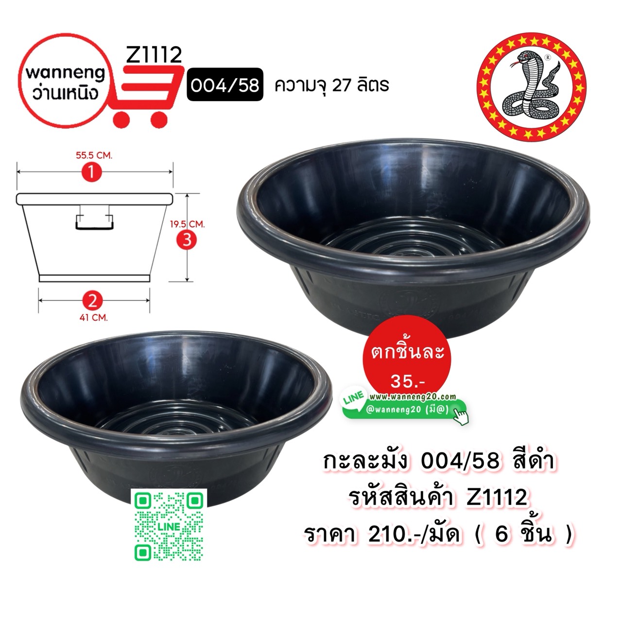 Z1112 กะละมัง 004/58 สีดำ (ตรางู) 1 มัด 6 ชิ้น