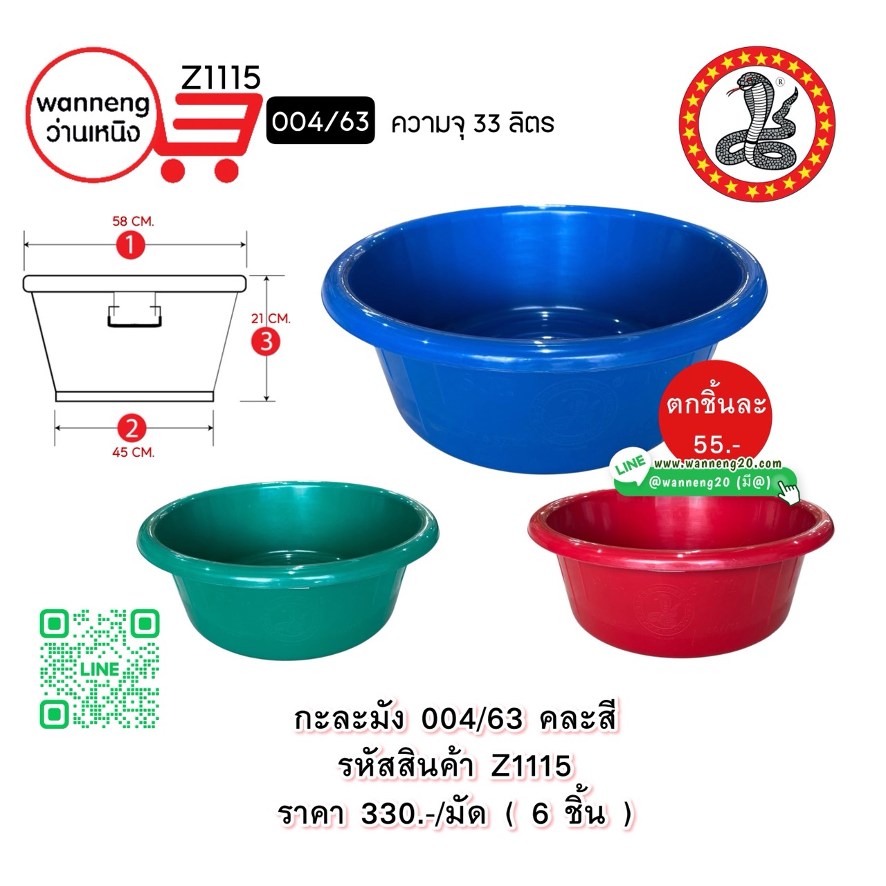 Z1113 กะละมัง 004/58 คละสี (ตรางู) 1 มัด 6 ชิ้น