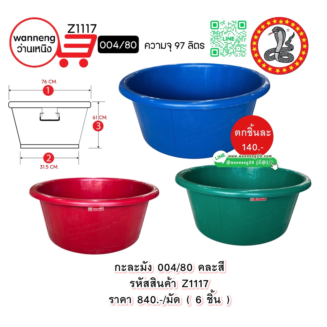 Z1117 กะละมัง 004/80 คละสี (ตรางู) 1 มัด 6 ชิ้น