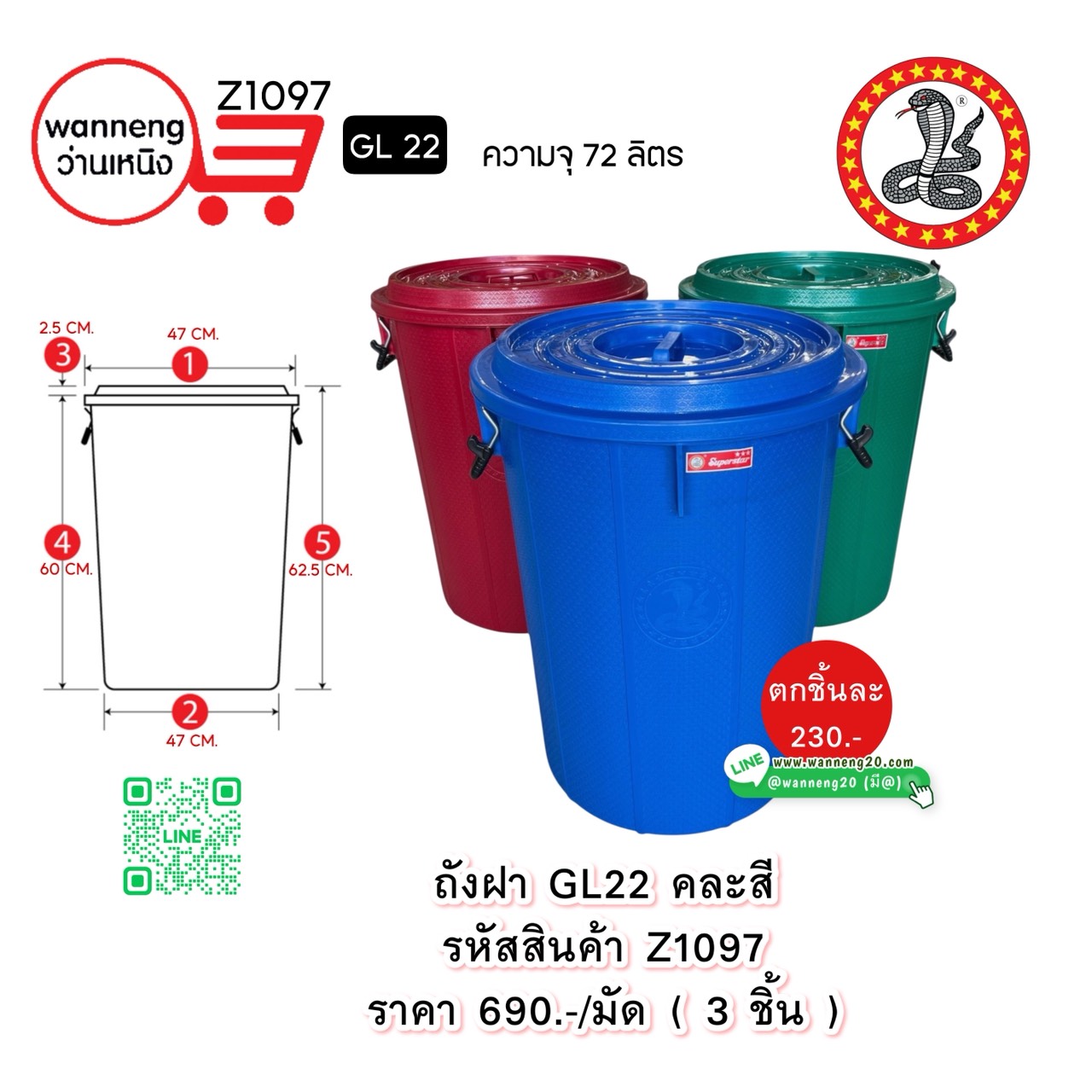 Z1097 ถังฝา GL22 คละสี 72 ลิตร (ตรางู) 1 มัด 3 ชิ้น