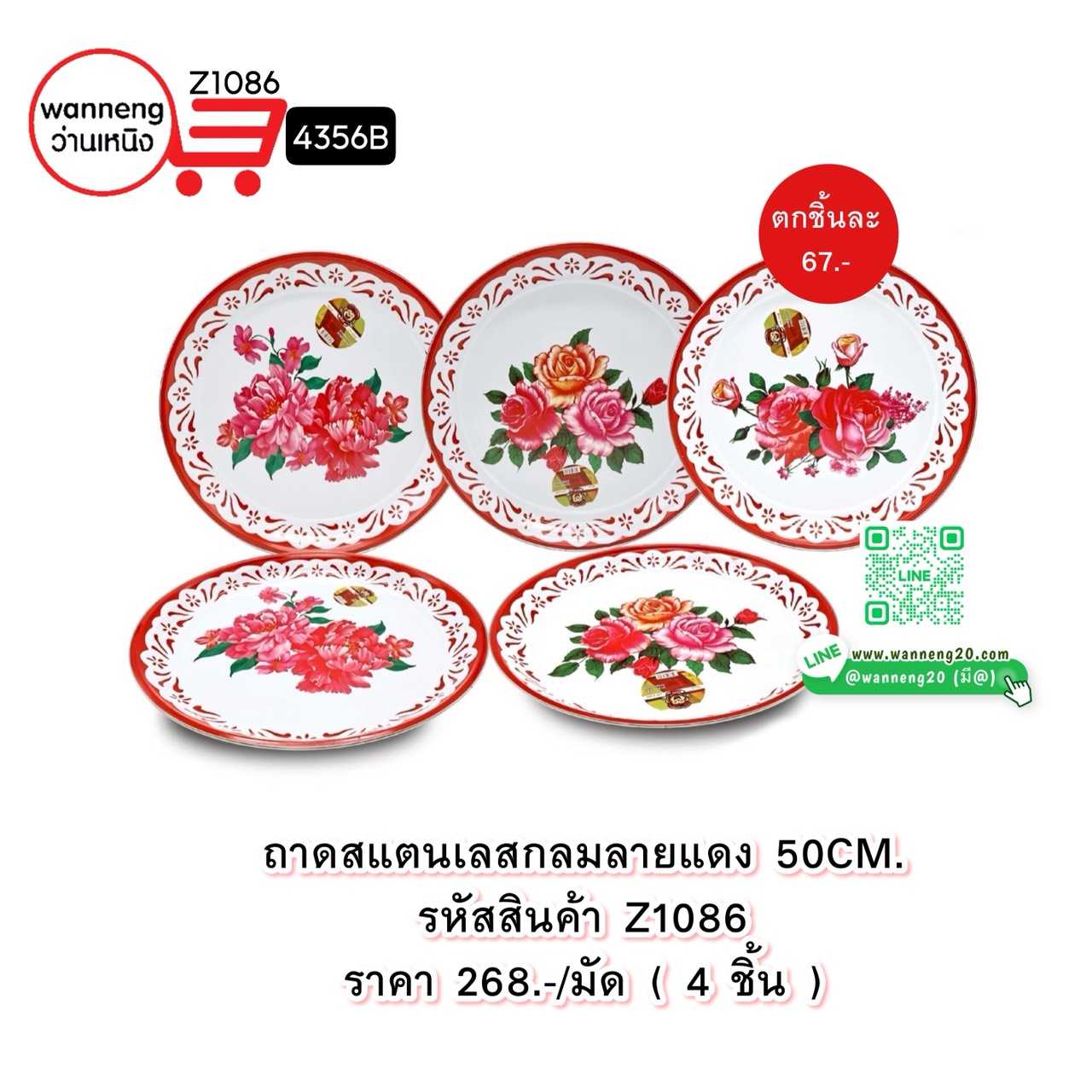 Z1086 ถาดสแตนเลสกลมลายแดง 50 CM. 4356B 1 มัด 4 ชิ้น