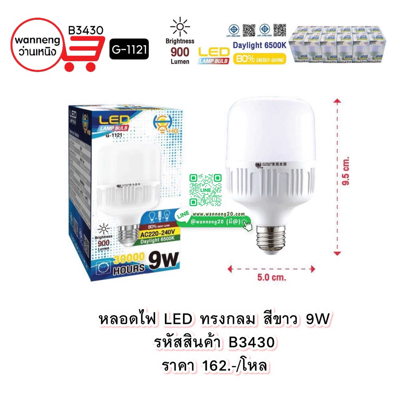 B3430 หลอดไฟ LED ทรงกลม สีขาว 9W G-1121 1 โหล
