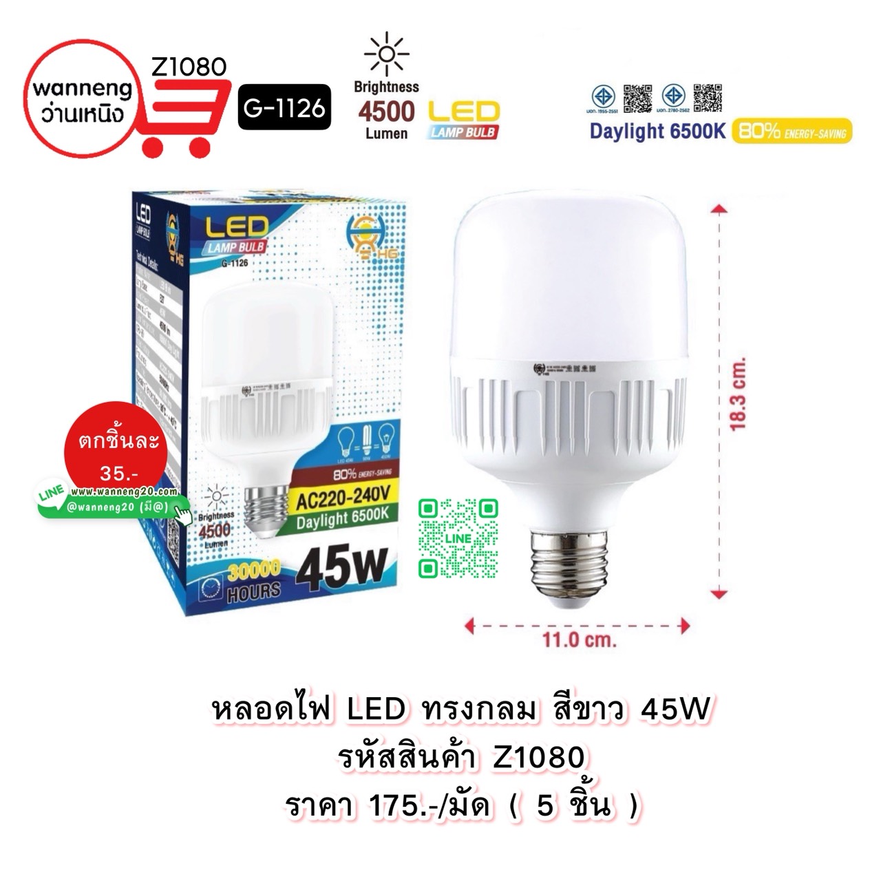 Z1080 หลอดไฟ LED ทรงกลม สีขาว 45W G-1126 1 มัด 5 ชิ้น