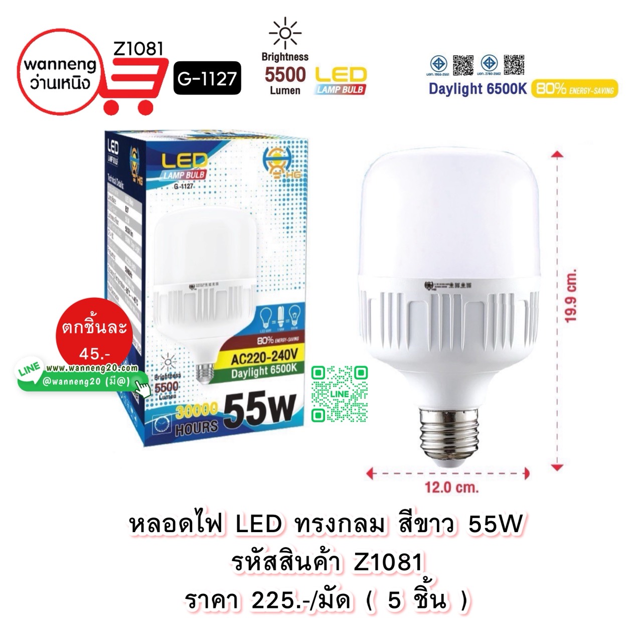 Z1081 หลอดไฟ LED ทรงกลม สีขาว 55W G-1127 1 มัด 5 ชิ้น