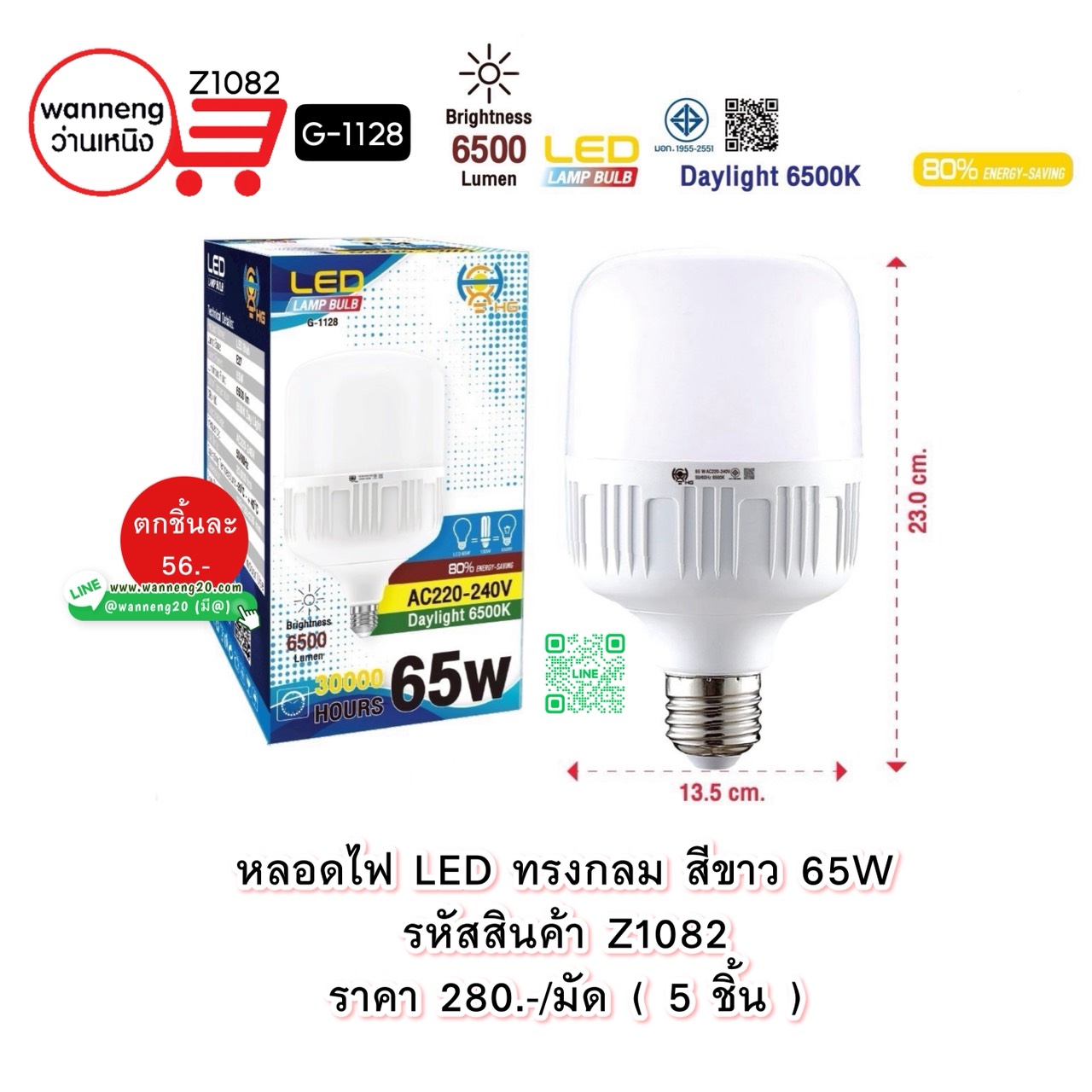 Z1082 หลอดไฟ LED ทรงกลม สีขาว 65W G-1128 1 มัด 5 ชิ้น