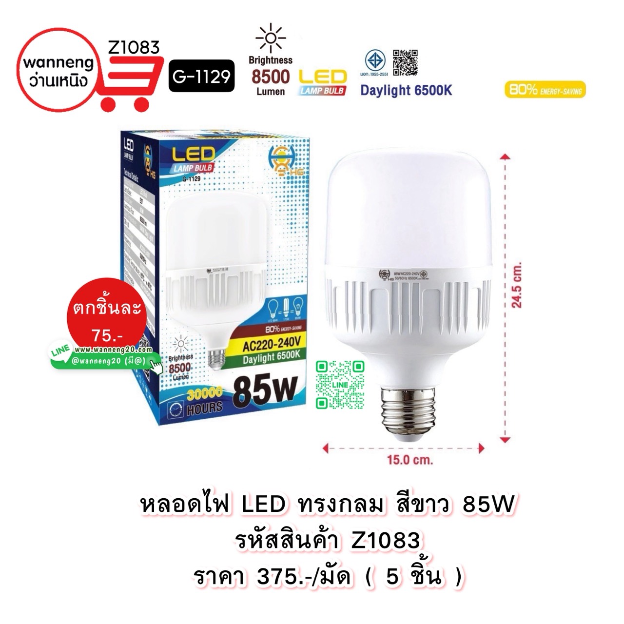 Z1083 หลอดไฟ LED ทรงกลม สีขาว 85W G-1129 1 มัด 5 ชิ้น