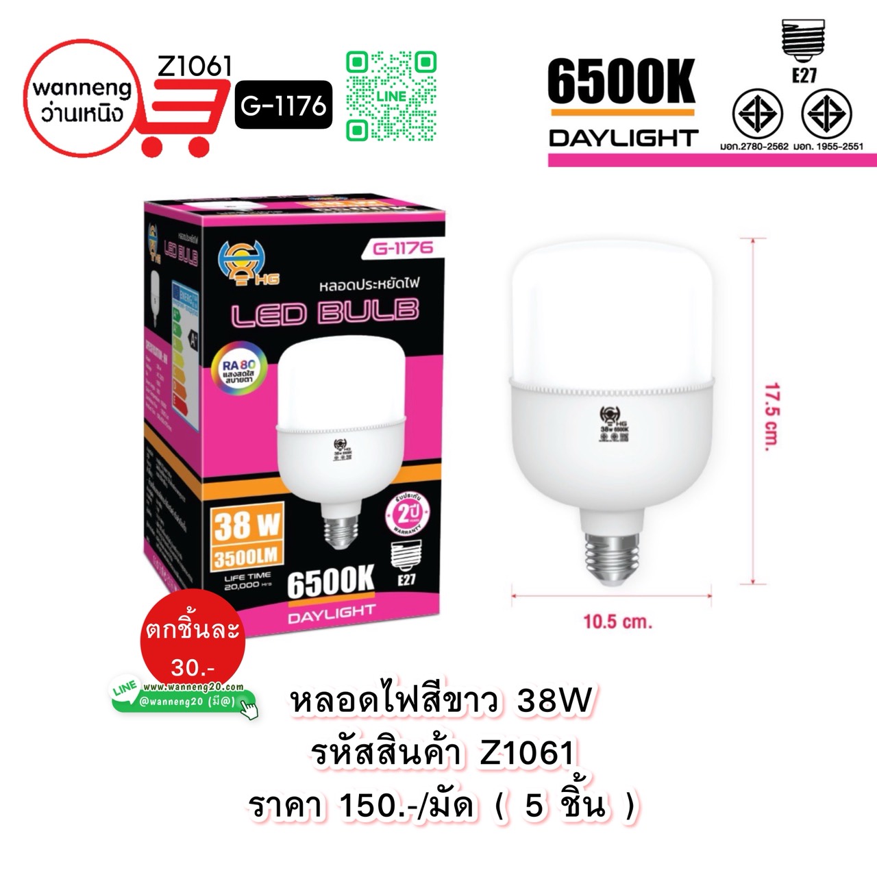 Z1061 หลอดไฟสีขาว 38W G-1176 1 มัด 5 ชิ้น