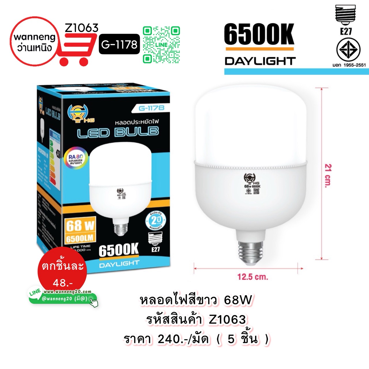 Z1063 หลอดไฟสีขาว 68W G-1178 1 มัด 5 ชิ้น