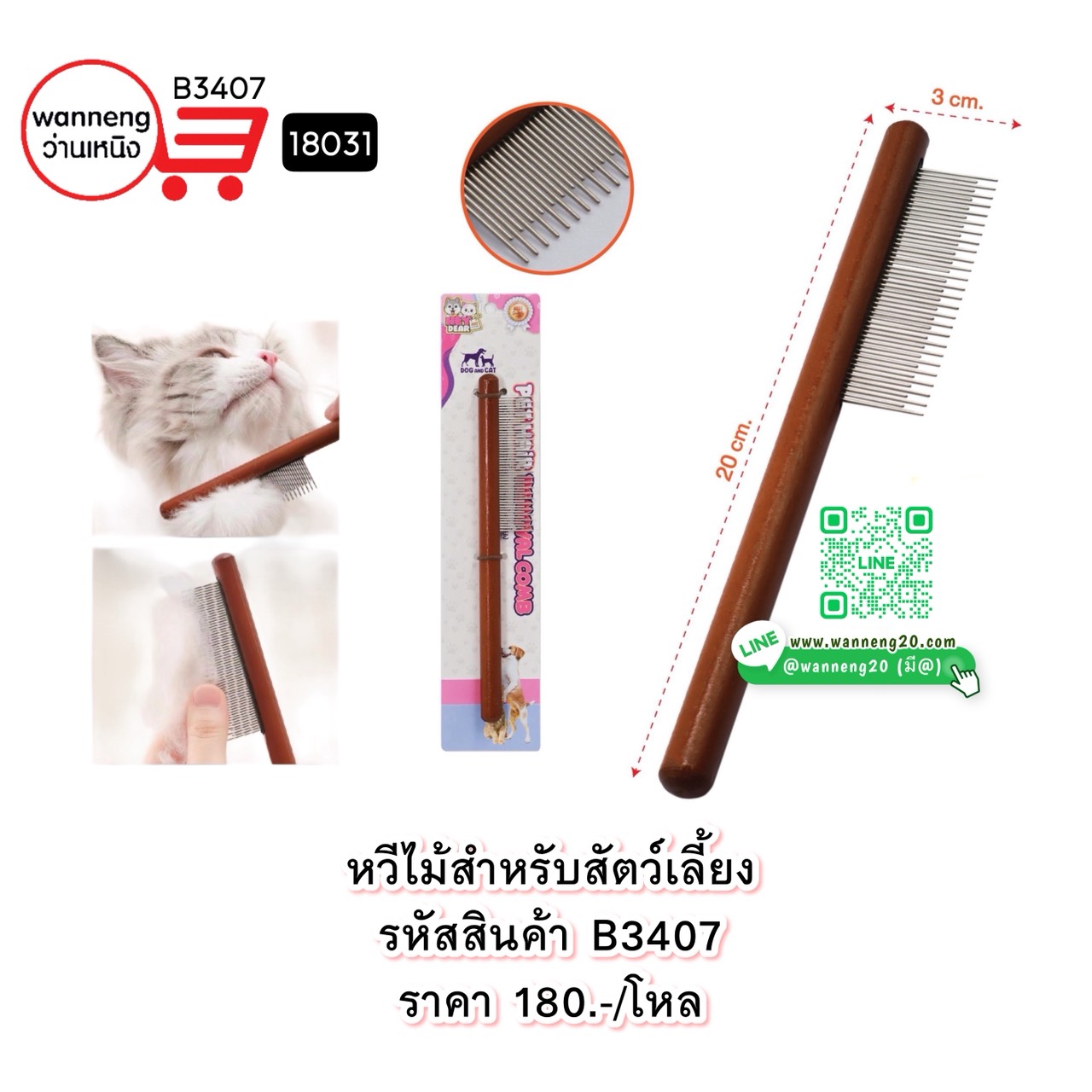 B3407 หวีไม้สำหรับสัตว์เลี้ยง 18031 1 โหล