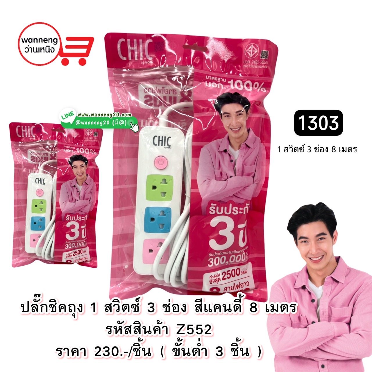 Z552 ปลั๊กชิคถุง 1 สวิตซ์ 3 ช่อง สีแคนดี้ 8 เมตร 1303 (ขั้นต่ำ 3 ชิ้น )