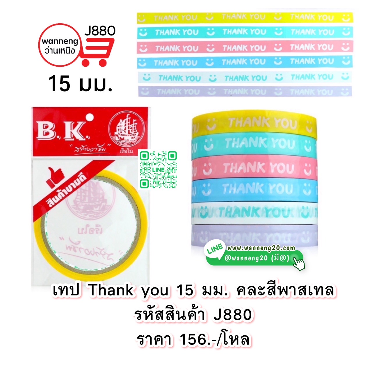 J880 เทป THANK YOU 15 มม. (คละสีพาสเทล) 1 โหล