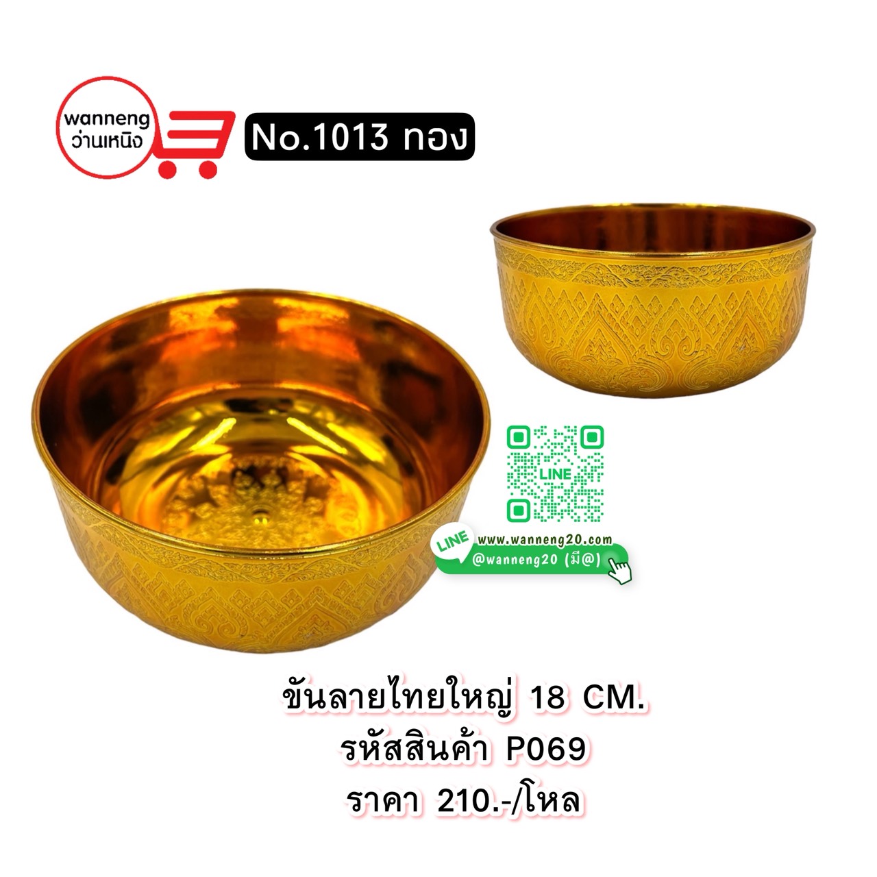 P069 ขันลายไทยใหญ่ 18 ซม. No.1013 สีทอง 1 โหล
