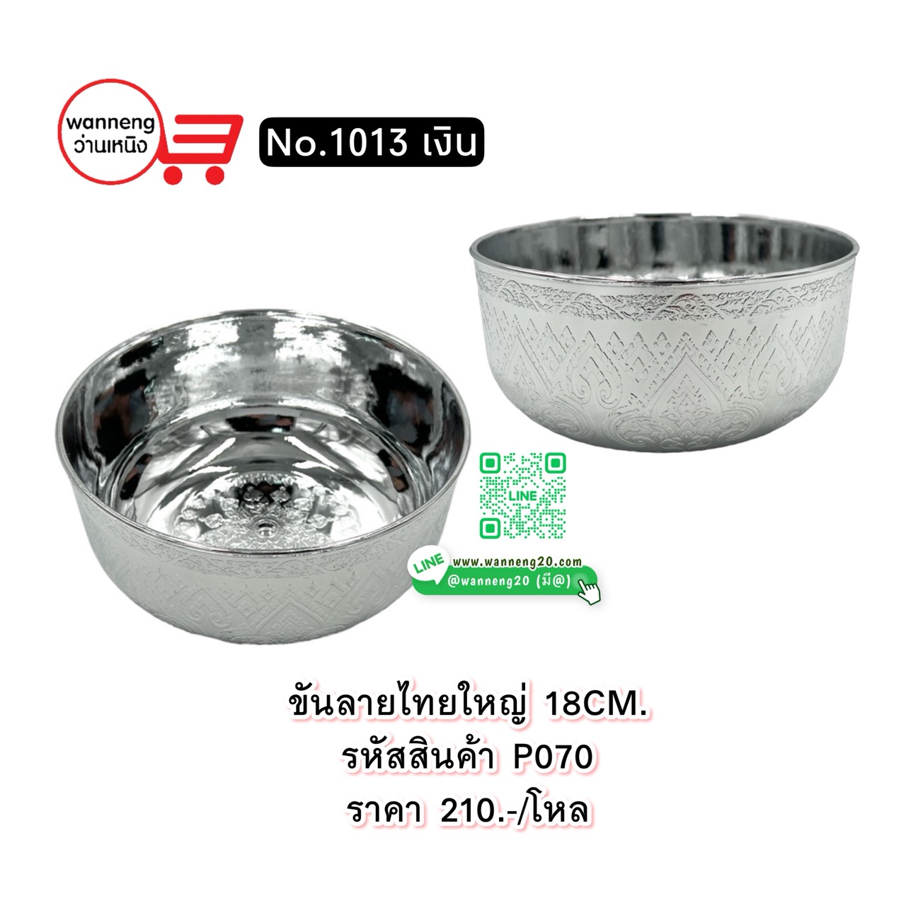 P070 ขันลายไทยใหญ่ 18 ซม. No.1013 สีเงิน 1 โหล