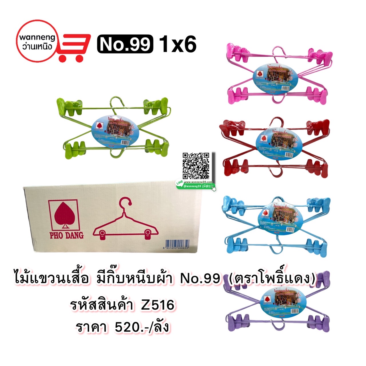 Z516 ไม้แขวนเสื้อ มีกิ๊บหนีบผ้า No.99 (ตราโพธิ์แดง) 1 ลัง