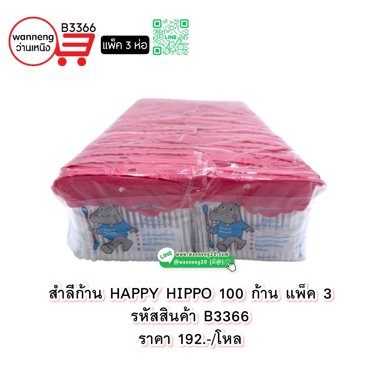 B3366 สำลีก้าน Happy Hippo 100 ก้านแพ็ค 3 1 โหล
