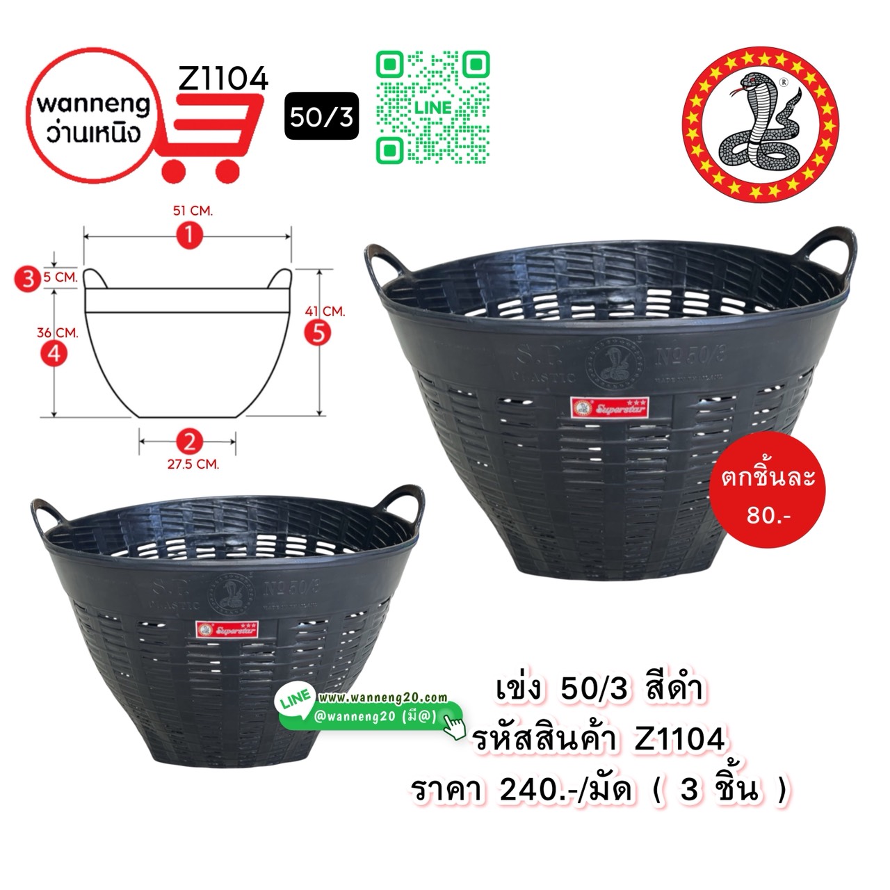 Z1104 เข่ง 50/3 สีดำ (ตรางู) 1 มัด 3 ชิ้น