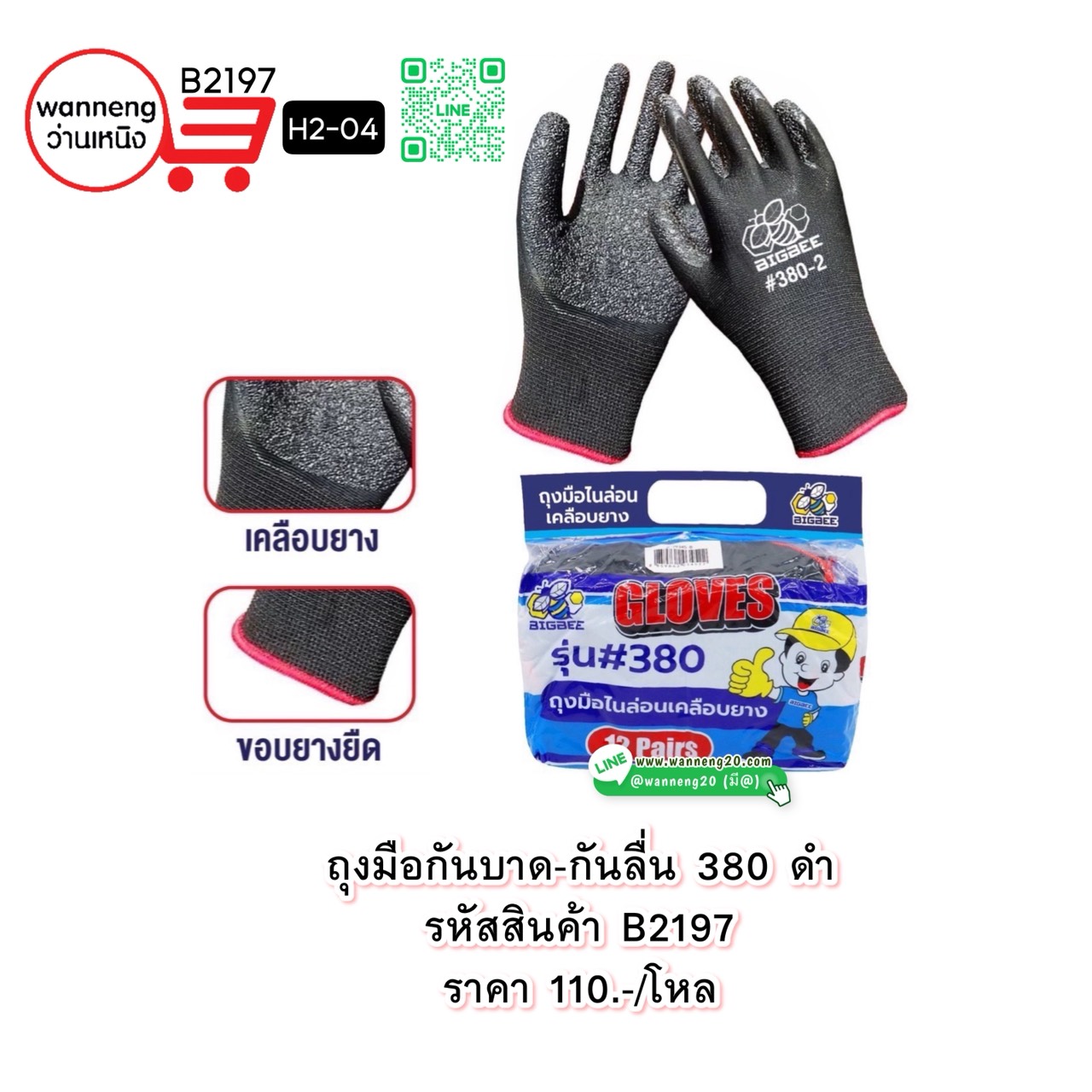 B2197 ถุงมือกันบาด-กันลื่น 380 ดำ H2-04 1 โหล