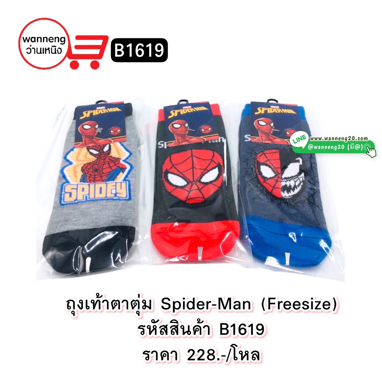 B1619 ถุงเท้าตาตุ่ม Spider-Man (freesize) 1 โหล