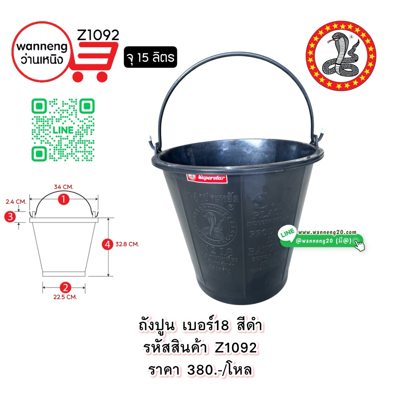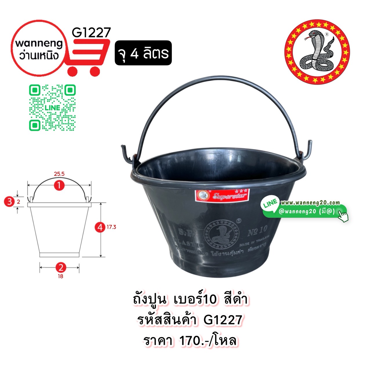 Z1092 ถังปูน เบอร์18 สีดำ (ตรางู) 1 โหล