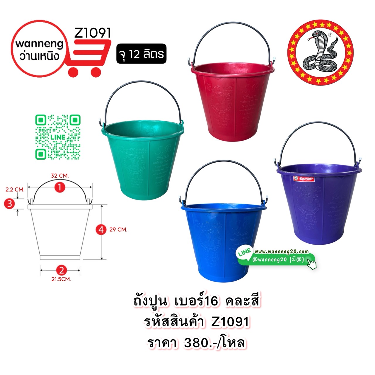 Z1091 ถังปูน เบอร์16 คละสี (ตรางู) 1 โหล