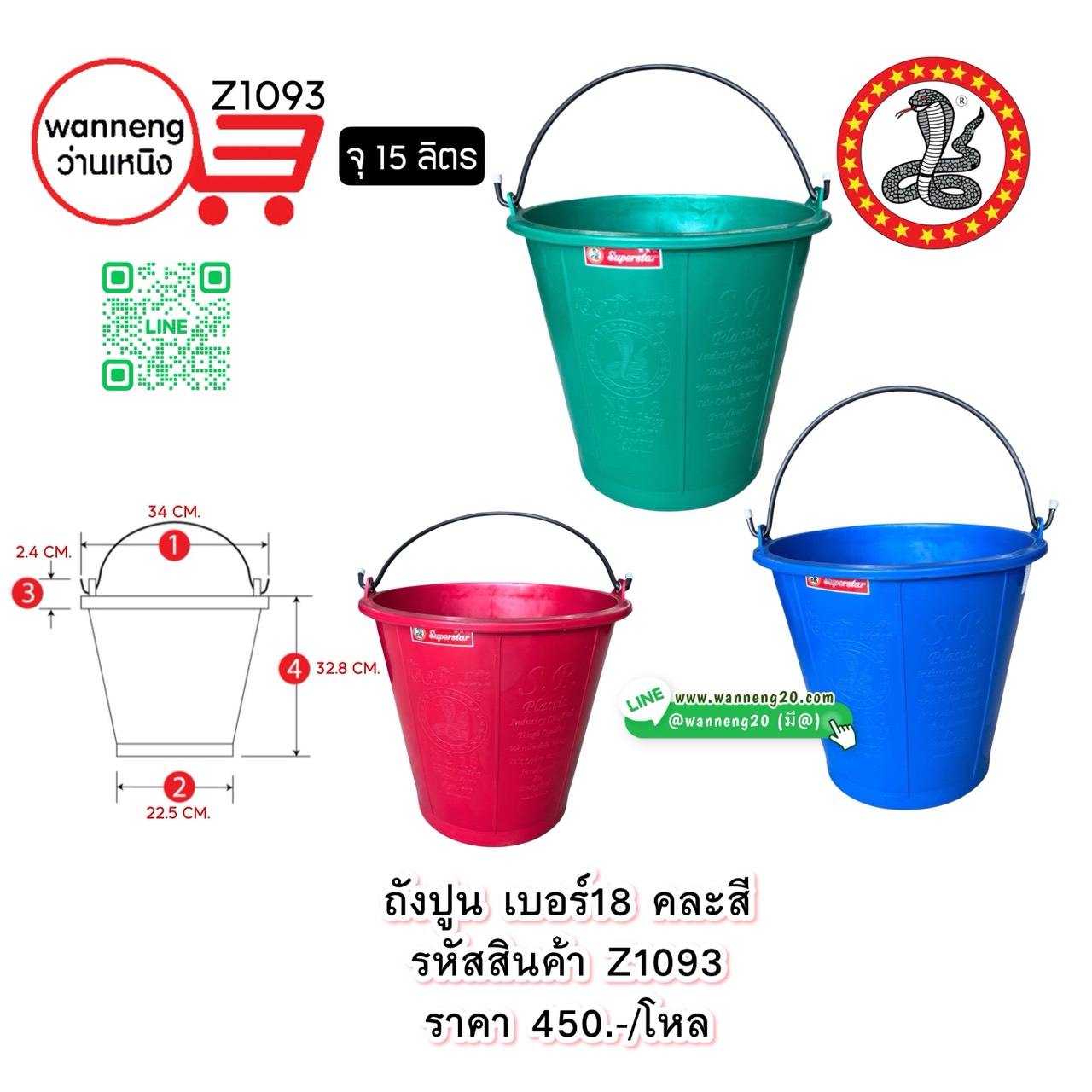 Z1093 ถังปูน เบอร์18 คละสี (ตรางู) 1 โหล