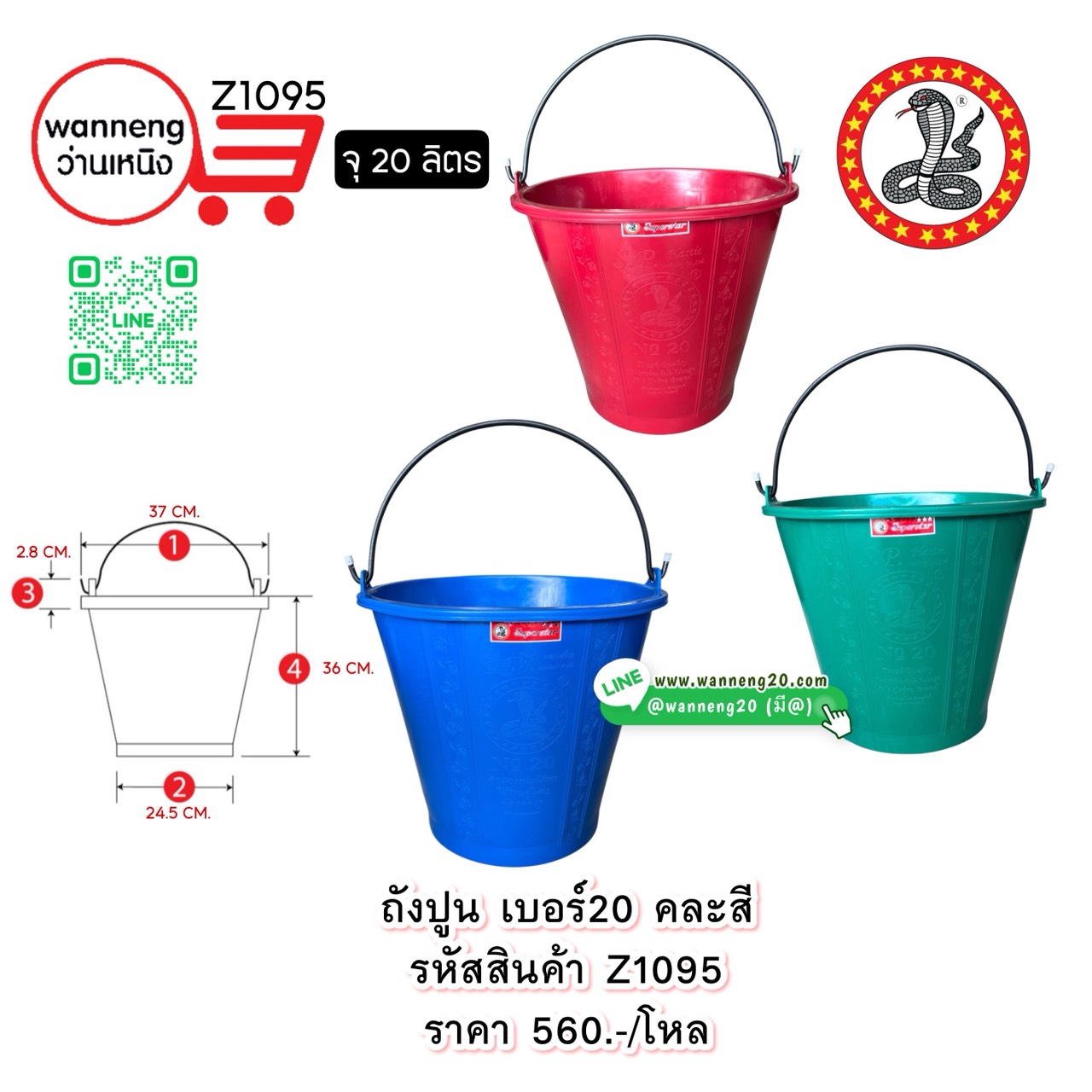 Z1095 ถังปูน เบอร์20 คละสี (ตรางู) 1 โหล