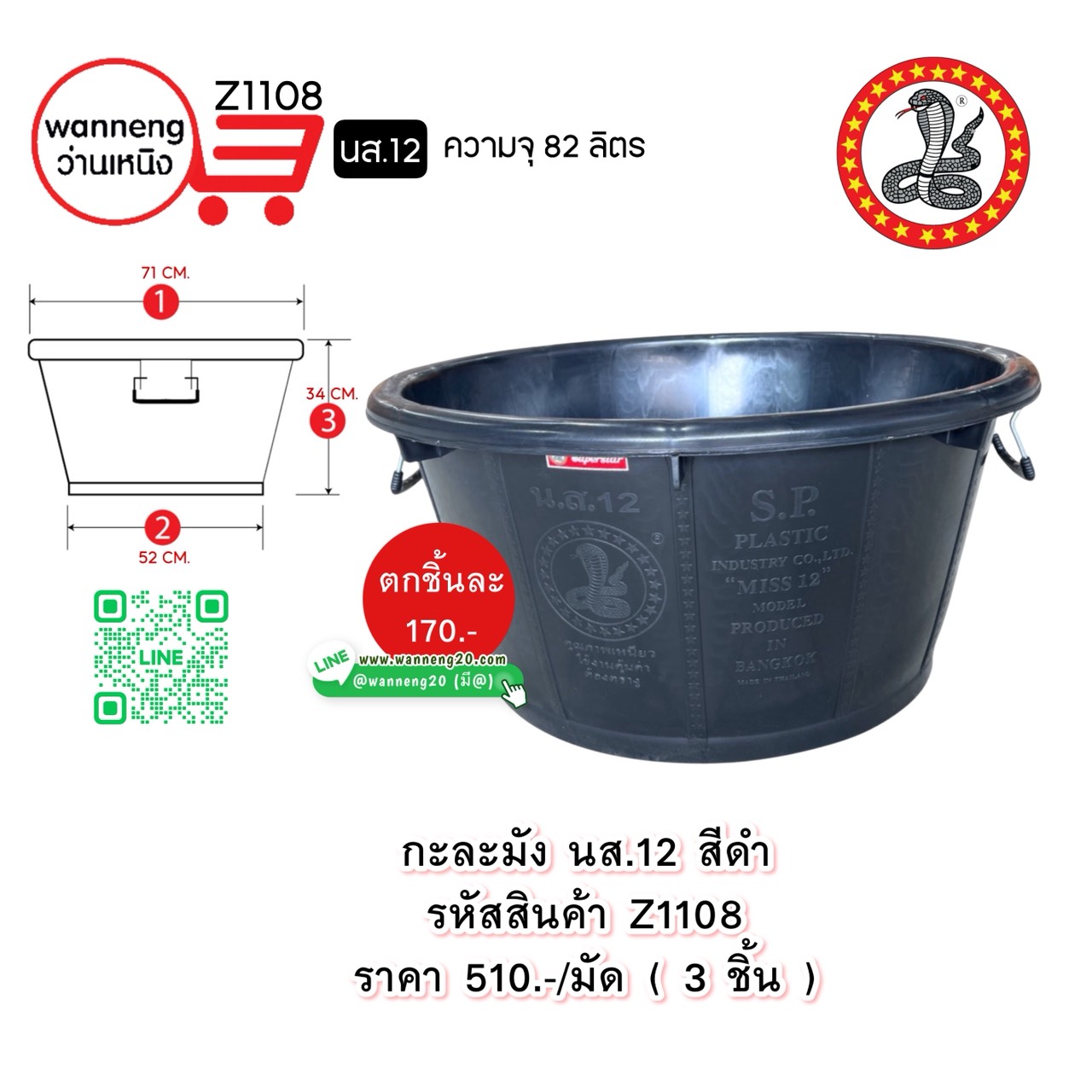 Z1108 กะละมัง นส.12 สีดำ (ตรางู) 1 มัด 3 ชิ้น