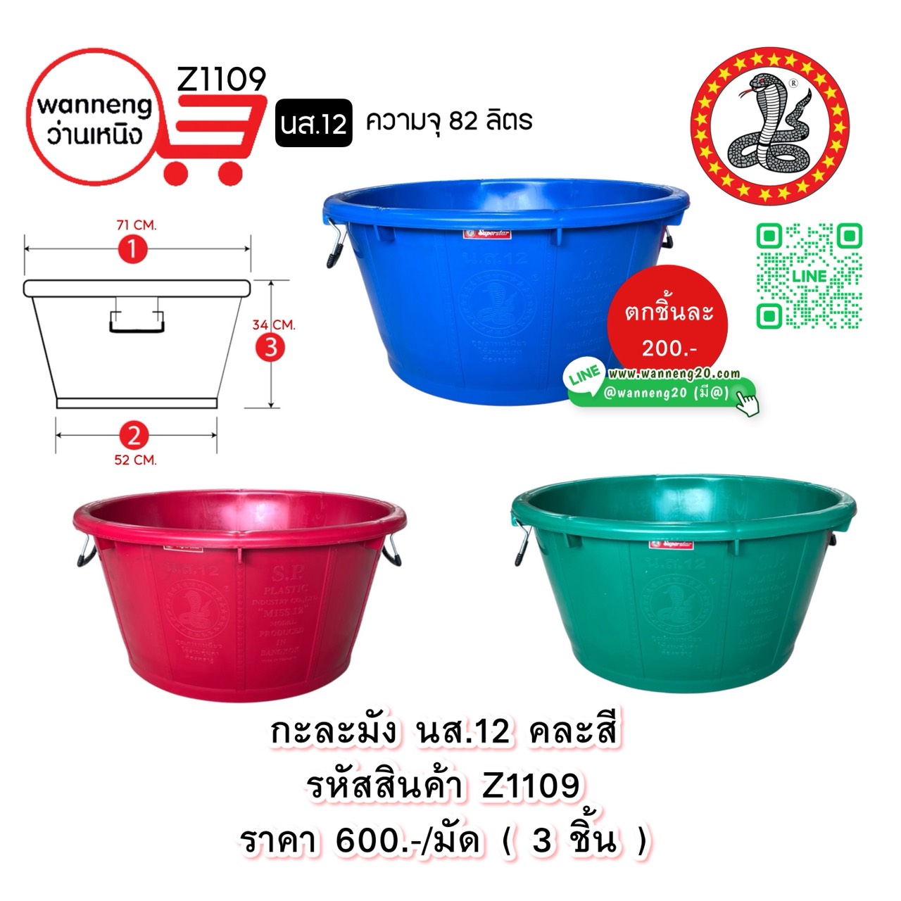 Z1109 กะละมัง นส.12 คละสี (ตรางู) 1 มัด 3 ชิ้น
