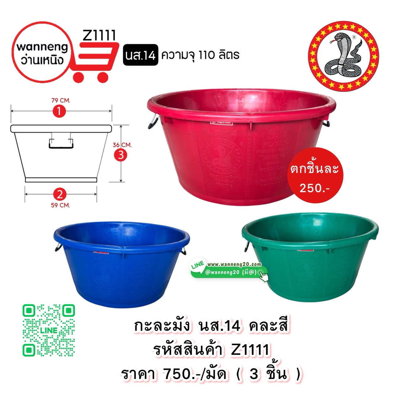 Z1111 กะละมัง นส.14 คละสี (ตรางู) 1 มัด 3 ชิ้น