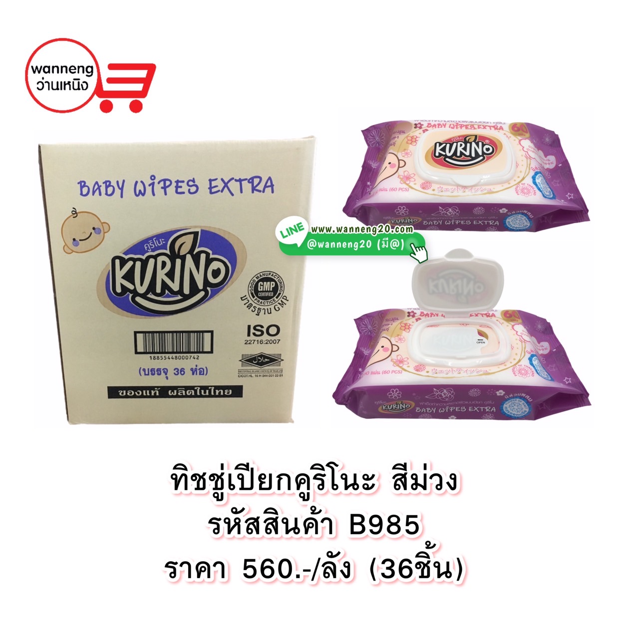 B985 ทิชชู่เปียกคูริโนะ สีม่วง 1 ลัง บรรจุ 36 ชิ้น